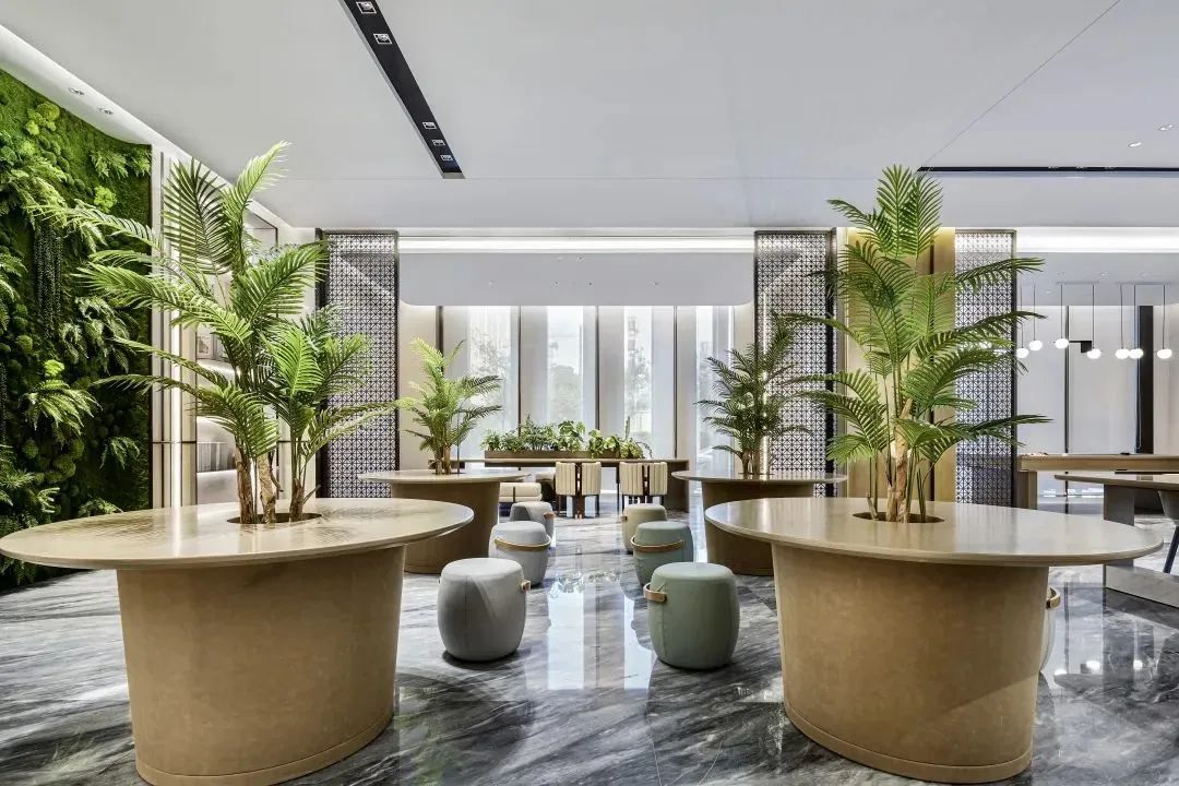 大堂門廳打造:大堂是客戶進入項目的第一印象區(qū),方隅十分看重這一區(qū)域的品質(zhì)感,會展項目的大堂有大理石地面,大篇幅的綠植墻面,同時配有會客區(qū)、臺球廳、會議室等功能區(qū)隔分明的公區(qū)。