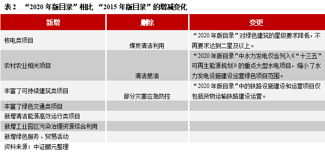“2021年版目錄”與發(fā)改委此前參照的《綠色債券發(fā)行指引》相比,變化非常大,體現(xiàn)在項(xiàng)目的分類、項(xiàng)目的具體要求方面,建議有意發(fā)行綠色企業(yè)債的發(fā)行人仔細(xì)學(xué)習(xí)“2021年版目錄”。“2021年版目錄”與人民銀行、證監(jiān)會(huì)、交易所、交易商協(xié)會(huì)參照的“2015年版目錄”目錄的差異如表2所示。