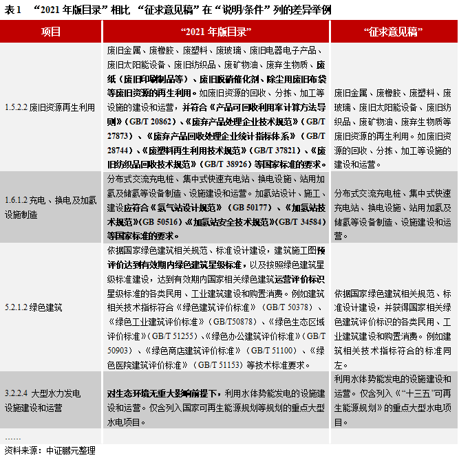 “2021年版目錄”與征求意見稿在一級(jí)、二級(jí)、三級(jí)、四級(jí)分類上保持一致,差異體現(xiàn)在項(xiàng)目的“說明/條件”,“2021年版目錄”在部分項(xiàng)目的“說明/條件”列更加具體細(xì)化了項(xiàng)目的要求,一方面進(jìn)一步增加目錄的可操作性,另一方面也提高了部分項(xiàng)目的相關(guān)標(biāo)準(zhǔn)。在具體操作時(shí),一定要仔細(xì)閱讀“2021年版目錄” 中各項(xiàng)目“說明/條件”列的相關(guān)要求。