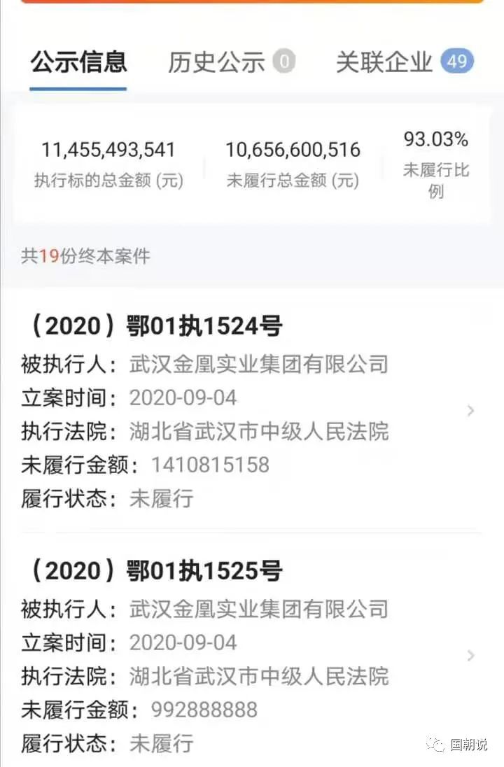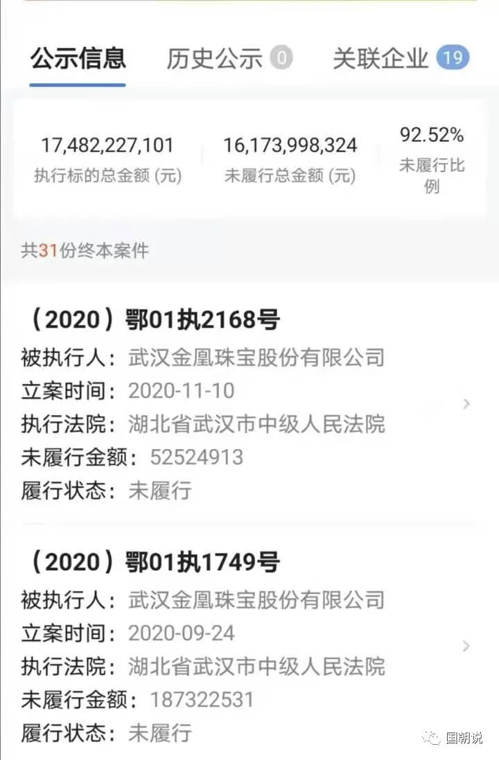 截止到現在,就債務信息來說,啟信寶數據統計顯示,單單武漢金凰珠寶股份有限公司這一個主體,當前執行標的金額為174.8億元,未履行總金額就達到161.7億元,而其大股東武漢金凰實業集團當前執行標的金額為114.5億元,未履行總金額就為106.5億元。
