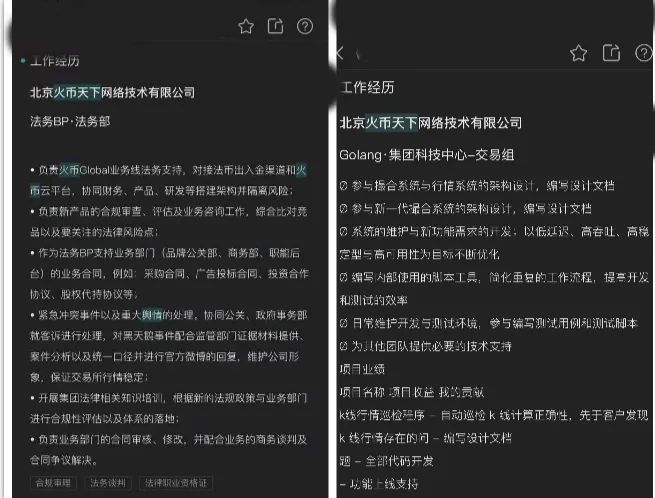 上述用戶的共同點在于,大量huobi global工作人員在北京火幣天下網絡科技有限公司入職,期間涉及多個部門,工作內容也都涉及到實際業務運營,還包括不同部門之間的對接協調。