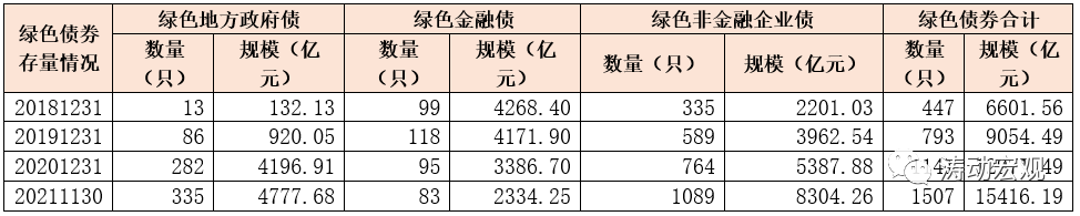 截至2021年11月30日,我國共有綠色債券1507只,規(guī)模合計(jì)15416.19億元(根據(jù)央行公布的信息、這一數(shù)值位居全球第二)。進(jìn)一步,綠色債券可分為金融機(jī)構(gòu)發(fā)行的綠色金融債和非金融企業(yè)發(fā)行的綠色債券。從變化上來看,綠色地方政府債和綠色非金融企業(yè)債的增長較快,2020年綠色地方政府債存量凈增3276億元,2021年以來綠色非金融企業(yè)債存量凈增2920億元。