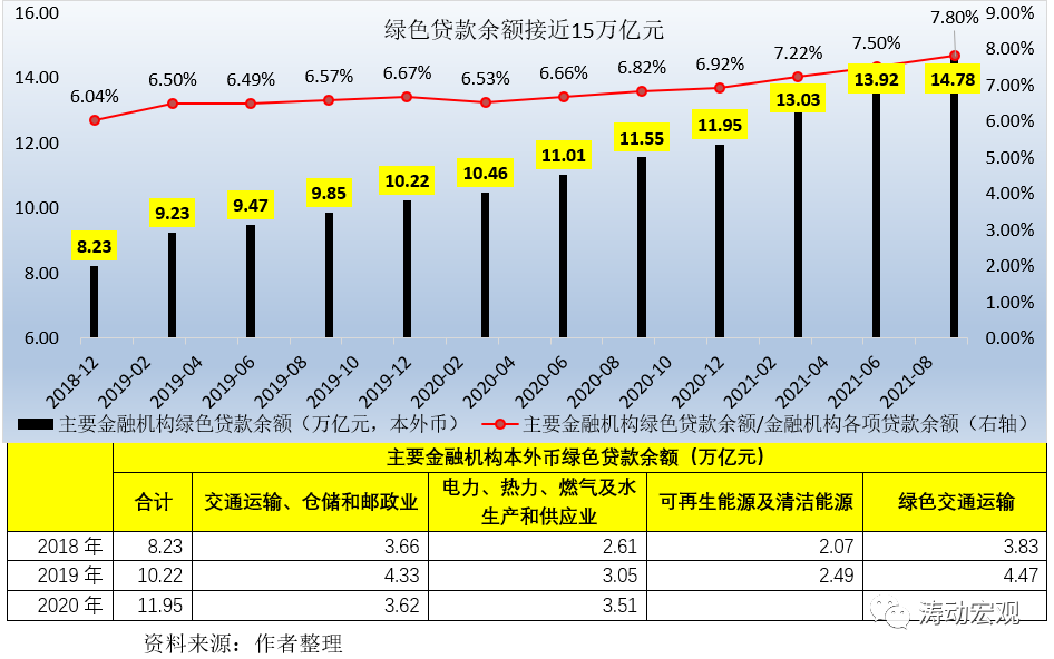 目前直接融資市場能夠給予綠色金融領(lǐng)域的支持力度明顯不夠,綠色債券規(guī)模剛剛超過1.50萬億元,因此綠色信貸仍是綠色金融的主力。截至2021年9月底,金融機(jī)構(gòu)綠色貸款余額達(dá)到14.78萬億(目前這一數(shù)值居全球第一位),占全部貸款的比例達(dá)到7.80%,從數(shù)值上看在金融機(jī)構(gòu)各項(xiàng)貸款中的比例趨勢提升。