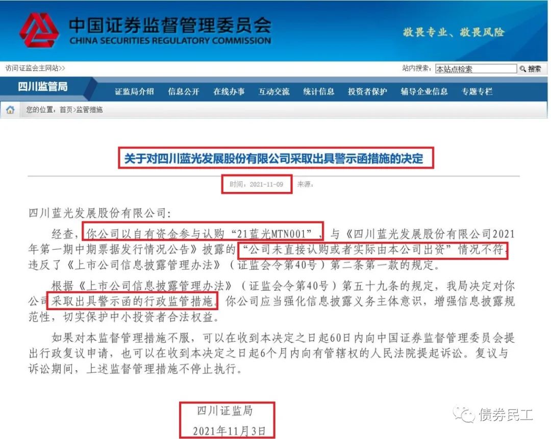 根據中國證監會四川監管局披露的信息,四川藍光發展股份有限公司(以下簡稱“藍光發展”)因以自有資金參與認購“21藍光MTN001”,被采取出具警示函的行政監管措施。這份監管措施的落款日期是2021年11月3日,公開披露日期是2021年11月9日。