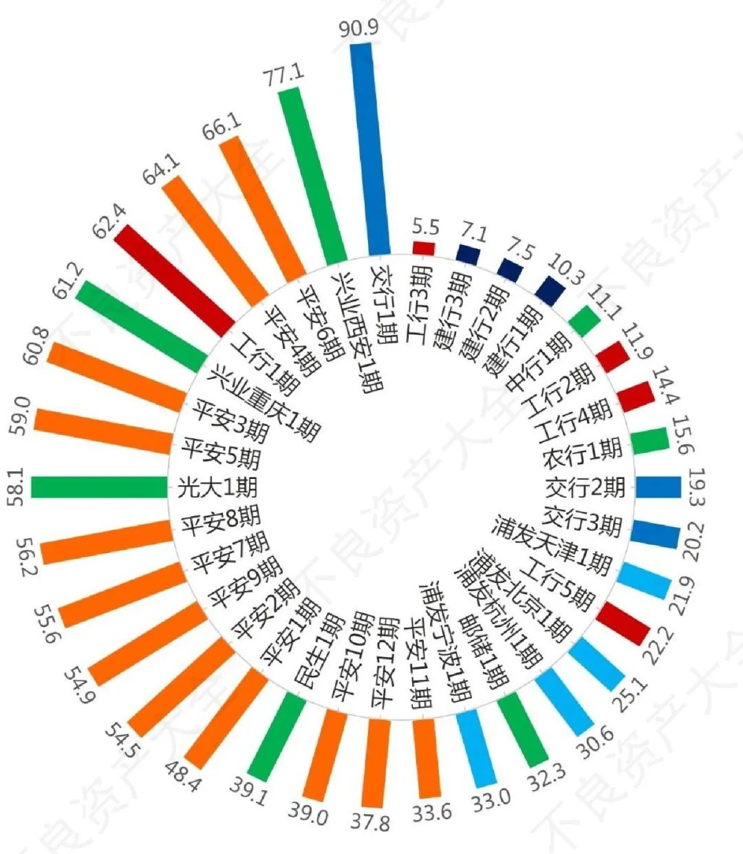 從已公告的34期銀行個貸不良資產(chǎn)來看,建行的三期平均逾期月數(shù)(按未償本息加權平均,下同)只有七個半月,即便在傳統(tǒng)清收領域,也不算長賬齡資產(chǎn)。而平均逾期月數(shù)最長的為平安銀行,接近五年。此外,工商銀行為41.6個月,交通銀行為31.9個月,浦發(fā)銀行為27.1個月,其余銀行則為1至5年不等。其中單期平均逾期月數(shù)最長的為交行1期的90.9個月,賬齡超過七年半;最短的為工行3期不足半年。就銀行個貸不良來看,賬齡分布比較全面,客觀上基本照顧到了不同賬齡專長的資產(chǎn)管理公司或處置機構。