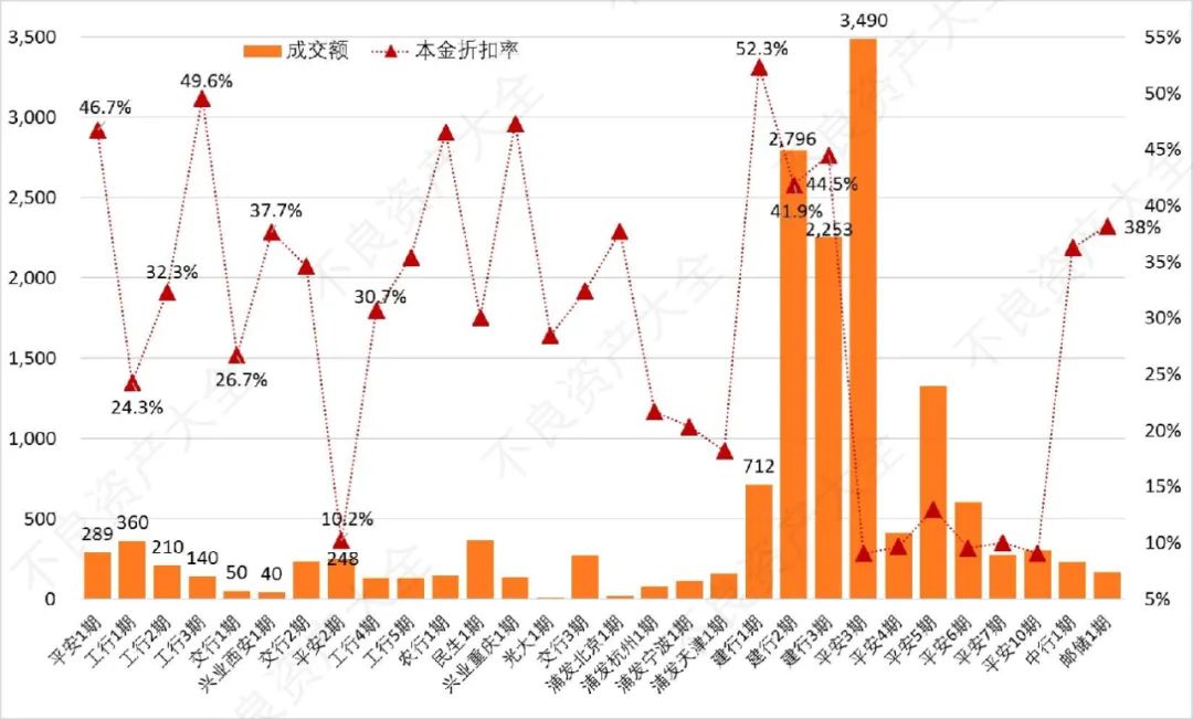 成交額固然是資產(chǎn)管理公司競價的時候考慮的重要因素之一,但成交額主要受預算限制,真正體現(xiàn)不良資產(chǎn)價格實質(zhì)上是本金折扣率。從已經(jīng)公布成交情況的若干期不良資產(chǎn)來看,平安銀行的本金折扣率整體偏低,建設銀行的正好相反,這也與各銀行出讓的不良資產(chǎn)總體情況相吻合。各期中本金折扣率最高的為建行1期,其也是各期中質(zhì)量最高的不良資產(chǎn)之一。