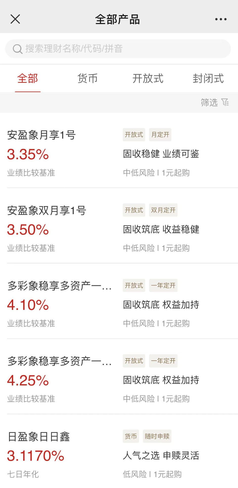 其中,貨幣產(chǎn)品即日盈象日日新,1元起購,低風(fēng)險,隨時申贖,快速轉(zhuǎn)出2小時內(nèi)到賬;開放式產(chǎn)品包括安盈象、多彩象、百寶象等系列,期限1個月到1年不等,為中低風(fēng)險的固定收益類產(chǎn)品;封閉式產(chǎn)品期限為兩年,包括安盈象固收穩(wěn)健兩年與安盈象強債穩(wěn)健兩年,同樣為中低風(fēng)險產(chǎn)品。
