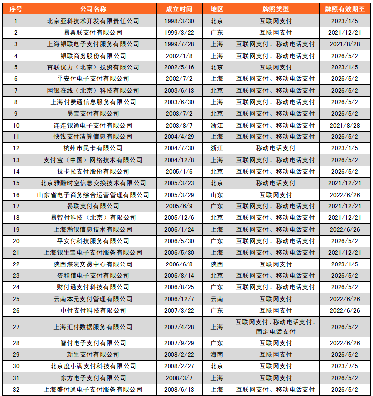 2021年5月13日,央行官網公布首批27張支付牌照續展結果,支付寶、財付通、銀聯商務、資和信、銀盛支付、通聯支付等24家支付機構全部通過續展。廣州銀聯網絡支付有限公司、北京數字王府井科技有限公司、北京銀聯商務有限公司擬與其控股股東銀聯商務股份有限公司開展整合工作,向人民銀行提交了中止續展審查申請,在中止審查期間繼續開展業務。