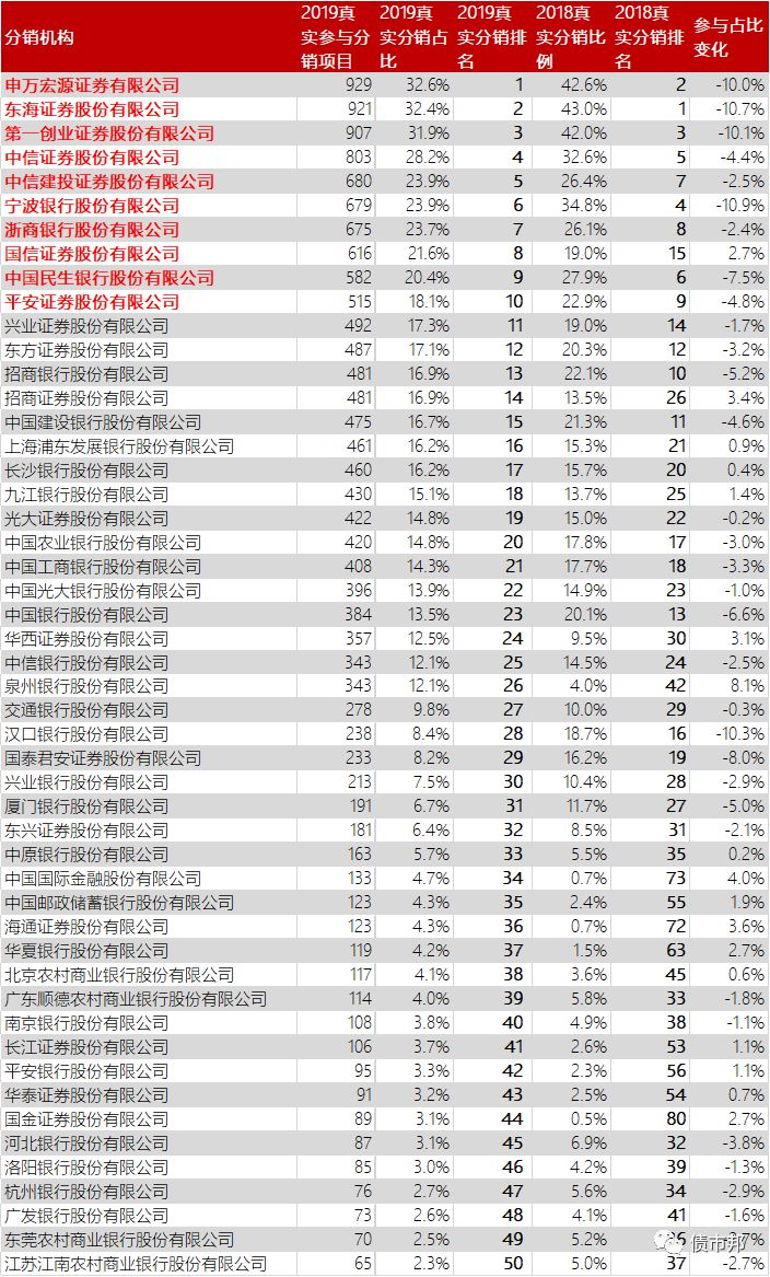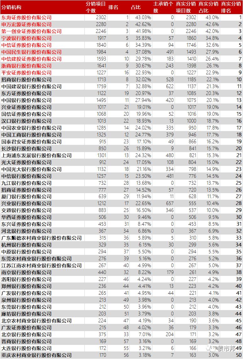 因?yàn)橹鞒袖N(xiāo)商天然就是承銷(xiāo)團(tuán)員,而狹義上的分銷(xiāo)是承銷(xiāo)團(tuán)員參與銷(xiāo)售非所在機(jī)構(gòu)主承的債務(wù)融資工具的行為,為了更好地進(jìn)行對(duì)比,將主承項(xiàng)目剔除后作為真實(shí)分銷(xiāo)項(xiàng)目進(jìn)行排名出來(lái)的TOP50,結(jié)果如下所示。
