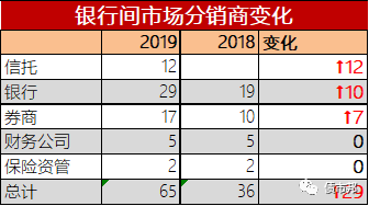 從數(shù)量上來(lái)看,2019年具有參團(tuán)分銷(xiāo)資格的市場(chǎng)成員,從2018年初的36家快速上升到65家,其中信托公司和銀行成為新增主力,分別達(dá)到12家和10家。