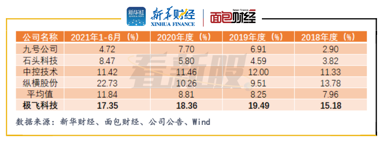 根據招股書披露的數據,極飛科技研發費用率處于較高水平。2018年至2021年上半年,極飛科技研發費用分別為4884.82萬元、6947.43萬元、9735.84萬元及8130.71萬元,占各期營收比例分別達到15.18%、19.49%、18.36%、17.35%,高于可比公司均值。
