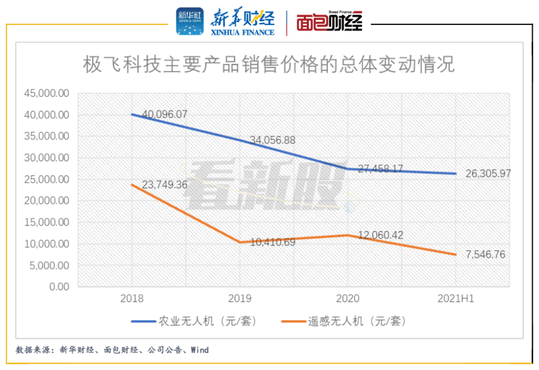 在激烈競爭之勢下,極飛科技核心產品也被迫持續降價。2018年至2021年6月,公司農業無人機的售價由4.01萬元/套下降至2.63萬元/套,降幅達34.39%;遙感無人機從2.37元/套降至7547元/套,降幅達68.22%。