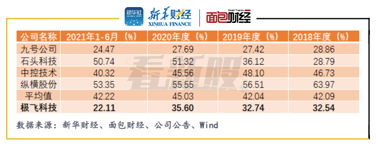 值得關注的是,極飛科技的毛利率也在持續走低。2021年上半年,公司毛利率滑坡至22.11%,低于可比公司均值約20個百分點。