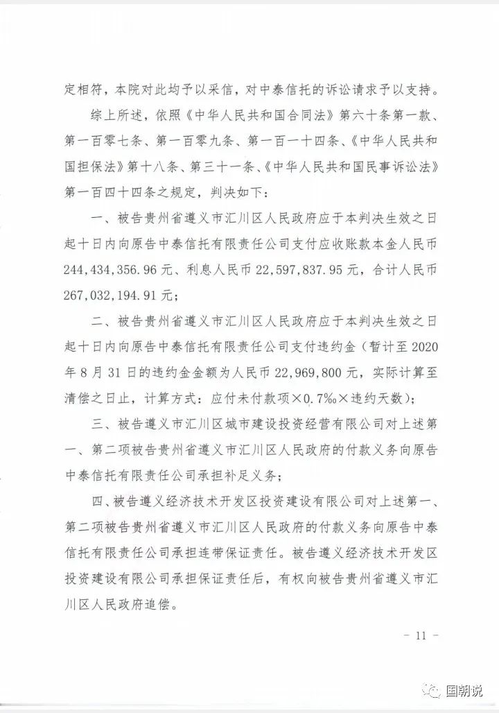 2020年12月30日,上海金融法院公布了一審判決結果,被告貴州省遵義市匯川區人民政府應于本判決生效之日起十日內向原告中泰信托支付應收賬款本金2.44億元,利息0.23億元,合計2.67億元。