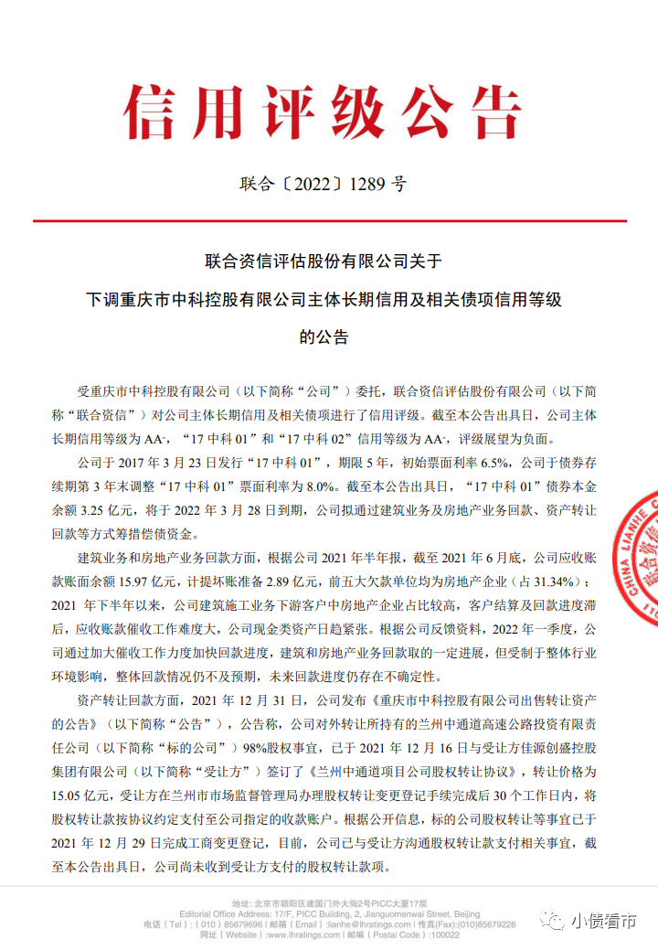 3月1日,聯合資信公告稱,將重慶市中科控股有限公司(以下簡稱“中科控股”)主體長期信用等級由“AA-”下調為“A”,將“17中科01”和“17中科02”信用等級由“AA-”下調為“A”,評級展望為“負面”。