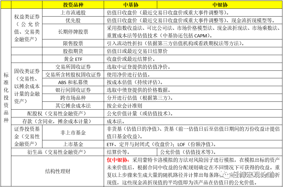 二、中基協(xié)與中銀協(xié)關(guān)于資管投資品種估值標準的對比