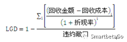 違約損失率,也就是當客戶發生違約后,債項損失的程度,等于1-回收率。《巴塞爾協議》強調“估計違約損失率的損失是指經濟損失”,而不是會計上的賬面損失。經濟損失要考慮回收成本和資金的時間價值,也就是利用合適的折現率計算禍首現金流的現值。所以《巴塞爾協議》下的違約損失率(LGD)為: