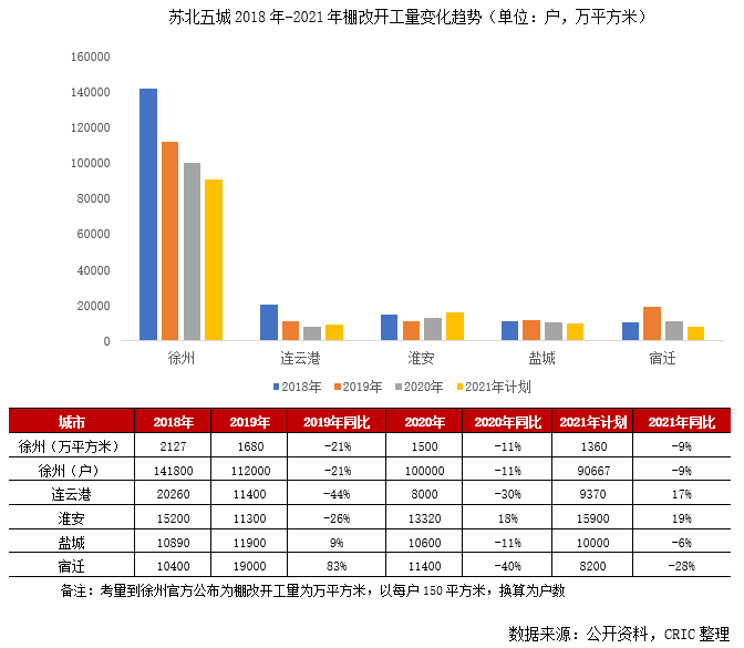 一是棚改正當(dāng)時,擴(kuò)充本地居民購力。雖然2020年正處全國棚改收官年,但蘇北諸市的棚改貨幣化安置卻方興未艾,以徐州為例,近年來棚改開工量均在千萬方級,2019年更是新開工量1700萬平方米位列全國第一,是唯一連續(xù)入選國家激勵名單的棚改城市,其余四城棚改開工套數(shù)普遍在8000-20000戶區(qū)間。