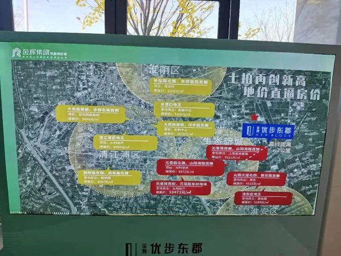 值得關(guān)注的是,蘇北部分城市在售樓盤也將周邊“地王”作為賣點,向客戶傳導(dǎo)房價上漲預(yù)期。譬如淮安的金輝優(yōu)步東郡、宿遷的奧園譽(yù)湖書院都在售樓處打出了類似標(biāo)識,房企“科普”地價驅(qū)動房價上漲預(yù)期,恐慌性購房現(xiàn)象在所難免。