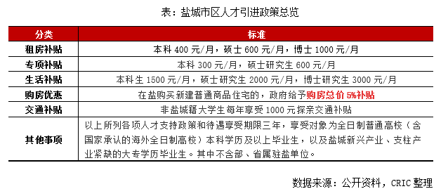 與此同時,鹽城為吸引人才也出臺了住房補(bǔ)貼、購房補(bǔ)貼、專項補(bǔ)貼、生活補(bǔ)貼、交通補(bǔ)貼等多種優(yōu)惠措施。譬如在鹽企業(yè)就業(yè)或自主創(chuàng)業(yè)的全日制本科及以上大學(xué)生,可以申請政府公租房或者享受租房補(bǔ)貼,本科400元/月、碩士600元/月、博士1000元/月。到鹽城縣市企業(yè)就業(yè)或者自主創(chuàng)業(yè)的大學(xué)生戶籍可在大市區(qū)落戶。在鹽購買新建普通商品住宅的,政府給予購房總價5%補(bǔ)貼。