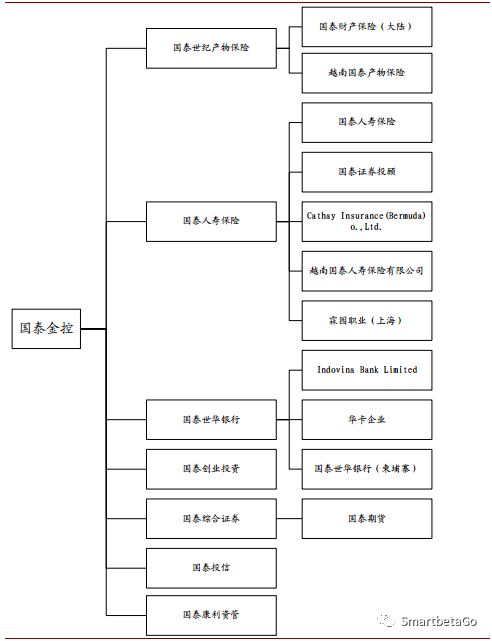 國(guó)泰金控采取“母公司上市、子公司下市”的上市模式上市,旗下核心資產(chǎn)有國(guó)泰世華銀行、國(guó)泰人壽、國(guó)泰產(chǎn)險(xiǎn)、國(guó)泰綜合證券、國(guó)泰投信。具體如下圖所示。