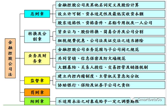 2001年6月臺(tái)灣正式實(shí)施《金融控股公司法》。該法案容許銀行、證券及保險(xiǎn)在內(nèi)的三種金融事業(yè)聯(lián)合經(jīng)營(yíng),并鼓勵(lì)金融機(jī)構(gòu)通過(guò)并購(gòu)提升企業(yè)活力,改善整體產(chǎn)業(yè)業(yè)績(jī)。該法案推出后,金融機(jī)構(gòu)跨界合作和兼并收購(gòu)加劇,臺(tái)灣金控集團(tuán)逐漸成為臺(tái)灣金融業(yè)的主體。《金融控股公司法》系監(jiān)管臺(tái)灣“金控”集團(tuán)的核心法規(guī),其具體內(nèi)容架構(gòu)如下圖。法規(guī)的鏈接:http://law.moj.gov.tw/LawClass/LawAll.aspx?PCode=G0380112。