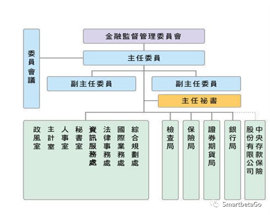 經(jīng)過(guò) 10 年左右的討論,最后確定在“行政院”下成立“金融監(jiān)督管理委員會(huì)”(簡(jiǎn)稱(chēng)“金管會(huì)”),將“財(cái)政部”下屬的金融局、保險(xiǎn)司、證期會(huì)與“中央銀行”下屬的金融業(yè)務(wù)檢查局以及“中央存款保險(xiǎn)公司”檢查處等機(jī)構(gòu)合并納入。 2004年7月“金融監(jiān)督管理委員會(huì)”掛牌成立,臺(tái)灣金融監(jiān)管自此進(jìn)入監(jiān)督、管理、檢查一元化時(shí)代。目前金融監(jiān)督管理委員會(huì)的組織架構(gòu)如下圖所示。