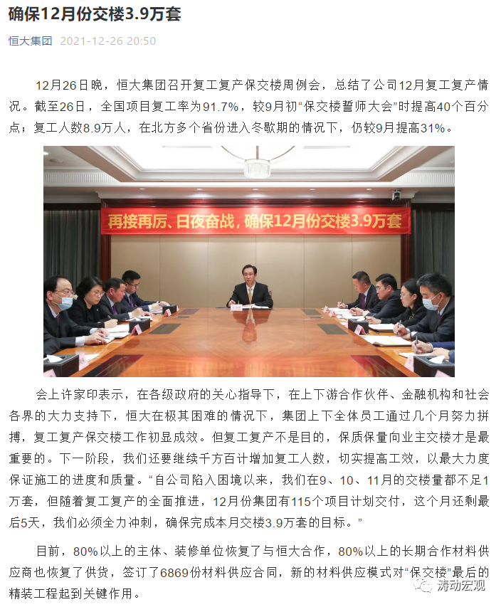 再比如,2021年12月26日晚間,恒大集團官方微信披露恒大集團召開復工復產保交樓周例會,指出目前恒大集團全國項目復工率為91.7%,較9月初“保交樓誓師大會”時提高40個百分點;復工人數8.9萬人,在北方多個省份進入冬歇期的情況下,仍較9月提高31%。恒大董事會主席許家印特別提及恒大在9、10、11月的交樓量都不足1萬套,而12月份恒大有115個項目計劃交付、將全力沖刺確保完成本月交樓3.9萬套的目標。