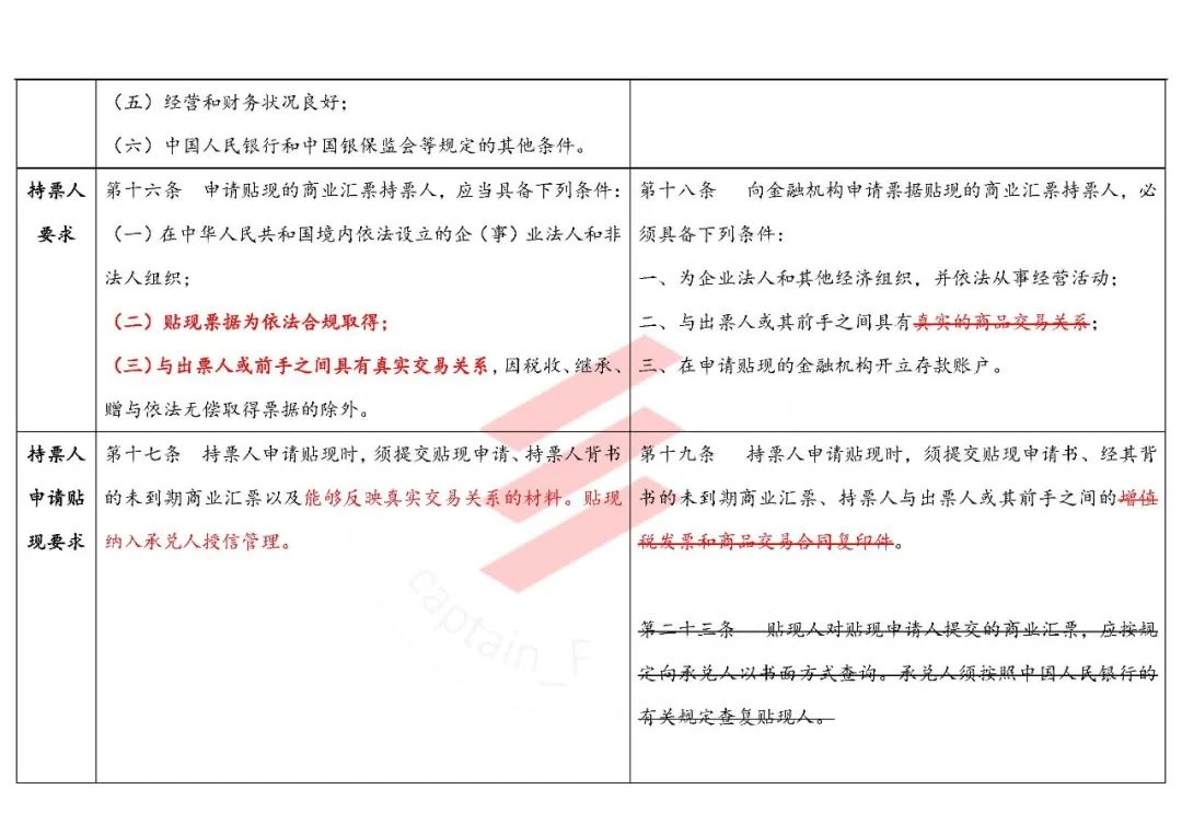 這里把原辦法“商品交易關系”,改為了與《票據法》相一致的“真實交易關系”,可謂是一個進步。但關鍵是又提出了“能夠反映真實交易關系的材料”(原來1997年的文直接列舉了增值稅發票和商品交易合同復印件),實際上可能還提高了貼現機構審查真實貿易背景的要求——其實后來的224號文之類的那套標準反而好用,因為很明確,告訴你合同和發票看復印件就行啦、電子商務企業看電子訂單也可以啊。