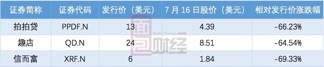 截至2018年7月16日,拍拍貸、趣店和信而富3家公司股價分別為4.39美元,8.51美元與1.84美元,相較發行價跌幅分別為66.23%,64.54%與69.33%。