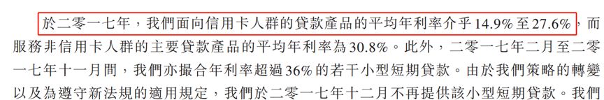 招股書顯示,2017年向信用卡人群的貸款產品平均年利率介乎14.9%到27.6%之間。