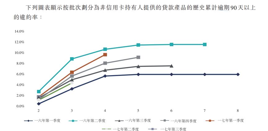 51信用卡招股書上提供的圖表上沒有標注詳細的違約率數據,只能從坐標軸上大致看到其區間。