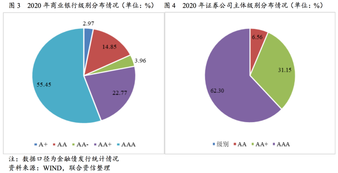 以金融機構發行金融債為口徑,篩選2020年整體發行商業銀行和證券公司的主體級別,商業銀行存續期共有101個主體發行商業銀行債和次級債券,其中信用為AAA級別的占比55.45%,其次為AA+主體占比達22.77%;信用級別A+的商業銀行占比達2.97%。相比證券公司,其信用級別分布多為AA+~AAA級別,未有低于AA級別以下主體發行債券,AA+~AAA信用等級占比高于商業銀行。