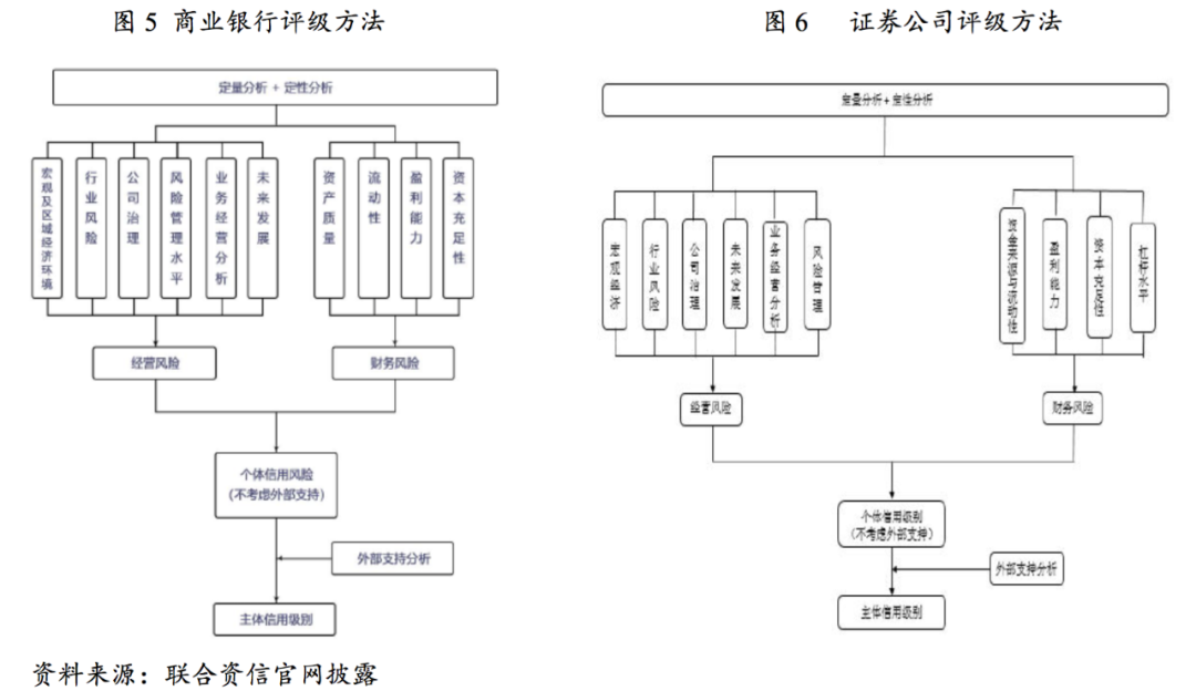 根據聯合資信官網披露的商業銀行和證券公司評級方法都是以定量結合定性分析,經營風險和財務風險矩陣的形式得到該行業自身個體信用等級,再通過外部支持分析得到主體信用等級。經營風險方面,商業銀行面臨宏觀和區域風險、行業風險、公司治理水平、風險管理水平、業務經營狀況、未來發展能力將影響銀行的信用風險;通常情況下面臨的宏觀和區域風險越低、行業風險越低、公司治理及風險管理能力越強、業務經營情況越好、未來發展能力越好的銀行,其經營風險越低。財務風險方面,銀行自身的資產質量、資本結構、盈利能力、流動性水平將影響銀行的信用風險;通常情況下,資產質量較高、資本充足、盈利能力較強、流動性水平較好的銀行,其財務風險較低。