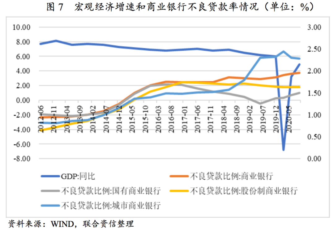 我們選取了宏觀經濟增速與商業銀行不良貸款率對比,明顯發現宏觀經濟增速與商業銀行不良貸款率為負相關,宏觀經濟越好,商業銀行不良貸款率越低。2012-2014年宏觀經濟增速達7%以上,整體商業銀行不良貸款率約1.00%左右,但隨著2015年宏觀經濟增速的逐步放緩,商業銀行不良貸款率也逐步開始攀升。截至2015年末,GDP增速為6.90%,商業銀行不良貸款率增至1.67%。2016-2019年,宏觀經濟增速持續下行,截至2019年末商業銀行不良貸款率攀升至1.86%,其中農商行主要屬地經營為主,區域經濟環境差異化較大,不良貸款率攀升至2.32%。2020年一季度受新冠疫情影響,GDP增速為-6.80%,雖第二、三季度有所回升,但未來商業銀行整體資產質量仍承壓。