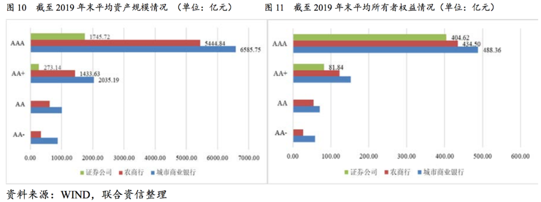 國有商業銀行和股份制商業銀行資產規模、凈利潤等規模性指標明顯優于證券公司,且其所在金融系統中具有重要地位。本文選擇債券市場上有存續主體級別的城商行、農商行以及同信用級別的證券公司進行對比。從資產規模來看,截至2019年末,主體信用級別為AAA級別城商行平均規模達6585.75億元,農商行次之,整體平均資產規模為證券公司3.7倍左右,主體信用級別AA+的證券公司與城商行、農商行差距達7~10倍左右;主體信用級別為AAA的城商行平均所有者權益規模達488.36億元,證券公司與其規模差距明顯低于資產規模對比情況。