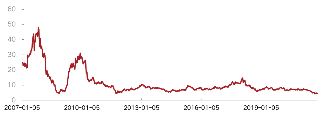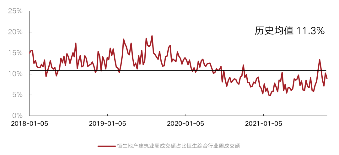 10月,恒生地產建筑業指數的成交額占恒生綜合行業總成交額之比月均值較上月回落。本月周均值8.8%,低于18年至今的歷史均值11.3%,較上月下降1.5個百分點,成交額出現回落。