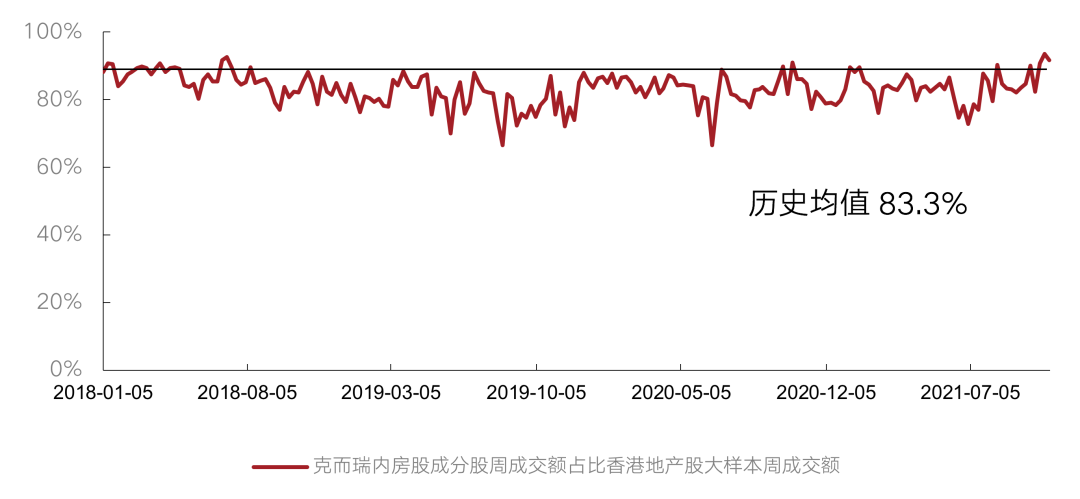 10月克而瑞內房股領先指數成交額占香港地產股大樣本的成交額比值總體較上月上升。10月該指數成交額占比周均值89.6%,高于歷史均值83.3%,高于上月周均值84.7%。