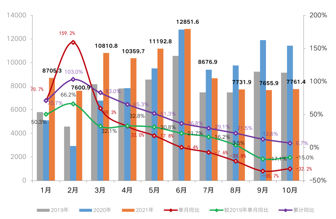 受下半年市場明顯降溫的影響,10月百強房企實現銷售操盤金額7761.4億元,單月業績規模較9月環比回升1.4%,同比降幅收窄至32.2%,同比去年同期延續了自7月以來的下跌趨勢。