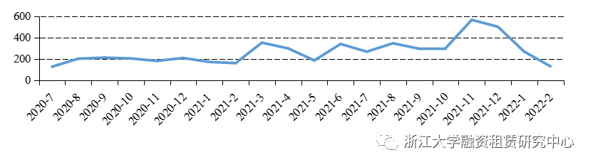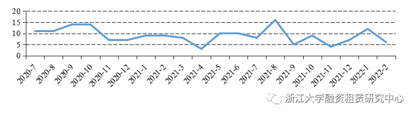 在發行數量方面,2022年2月共有7家融資租賃公司發行短融/超短融,發行總數為7支,較上月公司數減少5家,發行數量減少9支;較去年同期發行數量減少3支。
