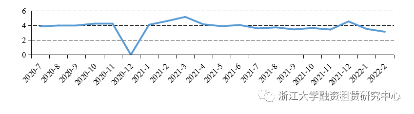 在發行利率方面,2022年2月融資租賃公司公司債平均發行利率為3.61%,環比下降6個BP,同比下降96個BP。其中中航國際租賃有限公司2022年面向專業投資者公開發行公司債券(第二期)和平安國際融資租賃有限公司2022年公開發行公司債券(第三期)(品種一)票面利率最低,均為3.20%,發行期限分別為5年和4年;中飛租融資租賃有限公司2022年面向專業投資者非公開發行公司債券(第一期)票面利率最高,為4.40%,發行期限為3年。