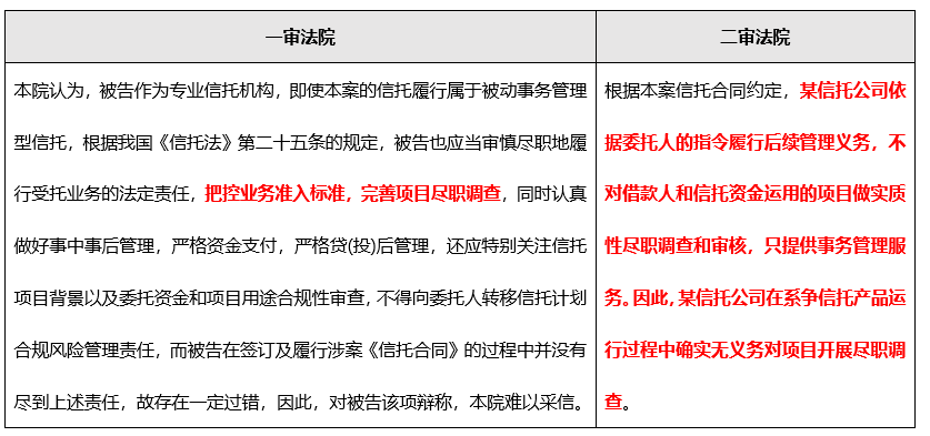 不難發現, 一審法院根據《信托法》第二十五條, 仍然認為無論是通道或主動管理的產品, 受托人均負有盡職調查義務, 換言之在一審法院的觀點中其實并沒有主動或通道的區別, 可以說是將“通道不免責”的監管要求貫徹到底。但二審法院的態度顯然就緩和得多了, 上海金融法院仍然認可了信托合同的約定, 依據合同約定, 認定某信托公司確實不負有盡職調查義務。