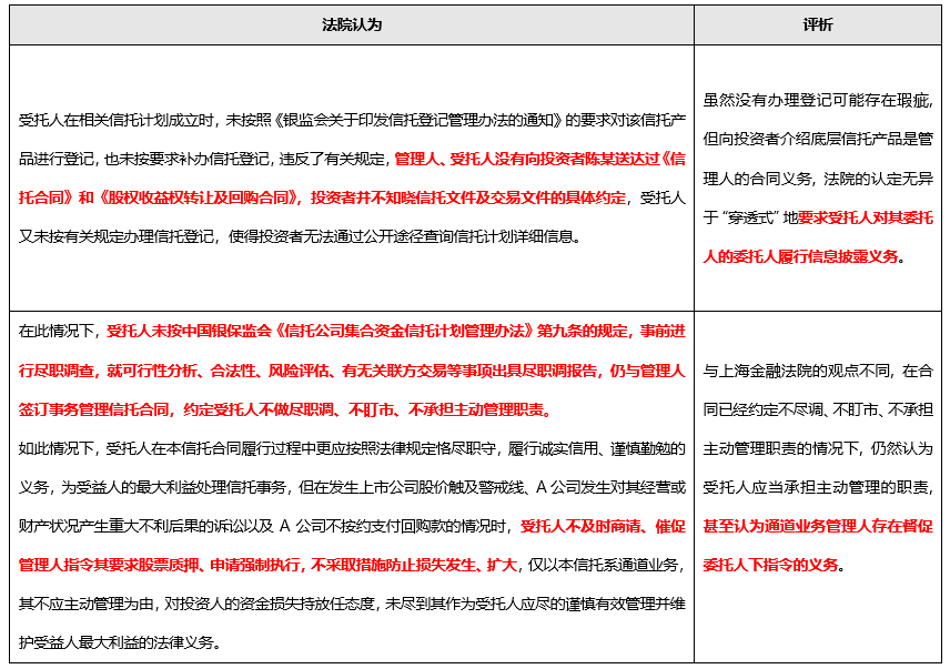 當然, 除了上述特殊的案件事實外, 一審和二審法院均提到了另一個重要的影響因素, 就是上海銀保監局此前對某信托公司作出了“存在對機構委托人未作充分調查,對其委托資金來源的調查流于形式,對該信托計劃的委托資金來源未盡到合規審查義務, 違反了審慎經營規則”的認定。由于無法查閱全文, 姑且不論銀保監基于哪些規定作出上述認定, 但在監管機構已經對受托人履職作出負面評價的情況下, 想要讓法院反過來認定受托人履職不存在過錯是極為困難的。