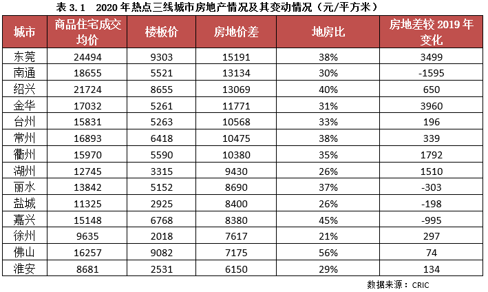 但總體來看,大部分熱點三線城市的房地差均在1萬元/平方米以上,地房比在40%以下,成本風險處于低位。但是如果將2020年房地差與2019年的相比,可以發(fā)現(xiàn),南通、麗水、鹽城、嘉興等城市的房地差是收窄的,尤其是南通,收窄幅度高達1595元/平方米,主要是原因就是由于2020年南通地價過快上漲導致