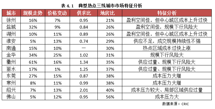 另外,結(jié)合上述我們研究的市場周期規(guī)律以及其盈利空間綜合評價來看,大多數(shù)熱點三線的市場前景仍然較佳,投資風險較低。最值得關(guān)注的當屬紹興、南通,兩城均受到長三角一體化利好的影響,在人口吸引力上具有一定的優(yōu)勢,去化速度較優(yōu)。但需要警惕的是,由于近年地價過快上漲,成本壓力大,利潤空間被極大的壓縮,尤其是中心城區(qū)的優(yōu)質(zhì)地塊,盈利空間堪憂。