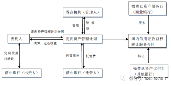 商業銀行理財資金或自有資金委托券商機構成立定向資產管理計劃,投資于信用證等福費廷資產。業務流程如下圖: