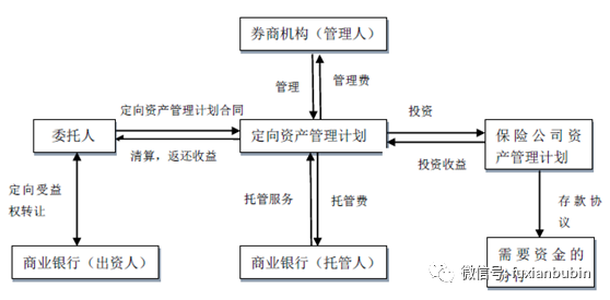 商業銀行自有資金委托券商機構成立定向資產管理計劃,委托保險資產管理公司用協議存款形式存入其指定銀行。借以增加商業銀行資金需求行的存款,提升其貸款能力,業務流程如下圖: