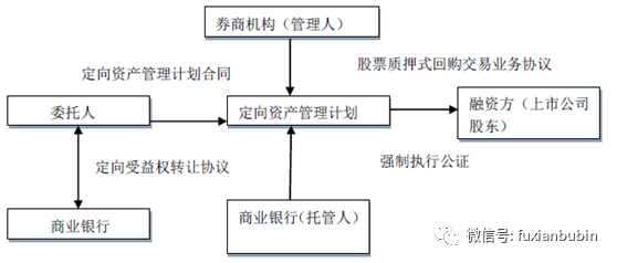 商業銀行理財資金或自有資金委托券商機構成立定向資產管理計劃,由券商機構進行交易所場內股票質押回購融資;股票質押回購融資亦可設計成集合資產管理計劃,由商業銀行出資投資或由商業銀行各分行代銷。項目可由商業銀行各分行及券商機構推薦。業務流程如下圖: