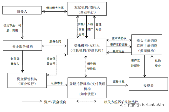 券商機構作為管理人成立專項資產管理計劃,投資于具有穩定、可預測現金流的資產,如應收賬款、收費權、信貸資產、BT協議回購款等等;商業銀行自有資金或理財資金認購該資產證券化產品,并可為專項資產管理計劃提供財務顧問服務。資產證券化產品可以在交易所掛牌轉讓,屬于標準化產品。具體業務流程: