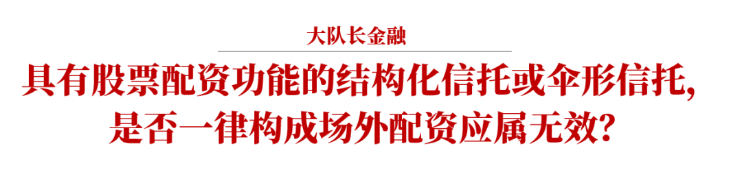根據(jù)2019年11月發(fā)布的《全國法院民商事審判工作座談會紀(jì)要》(以下簡稱《九民紀(jì)要》)第86條的規(guī)定,場外配資合同無效。最高人民法院民事審判第二庭在其編著的《全國法院民商事審判工作會議紀(jì)要理解與適用》一書中認(rèn)為:“單一資金信托業(yè)務(wù)屬于信托公司正規(guī)的證券投資信托方式,也稱陽光私募,其投資收益和風(fēng)險(xiǎn)不分層,依法成立的單一資金信托合同應(yīng)屬有效。對于在本輪股市劇烈波動中引發(fā)巨大爭議的結(jié)構(gòu)化信托和傘形信托合同效力問題,我們認(rèn)為,對于具有股票配資功能的結(jié)構(gòu)化信托和傘形信托,應(yīng)當(dāng)認(rèn)定為場外配資合同,在信托公司未取得融資融券國家特許經(jīng)營許可的情況下,應(yīng)當(dāng)認(rèn)定合同無效。”[1]